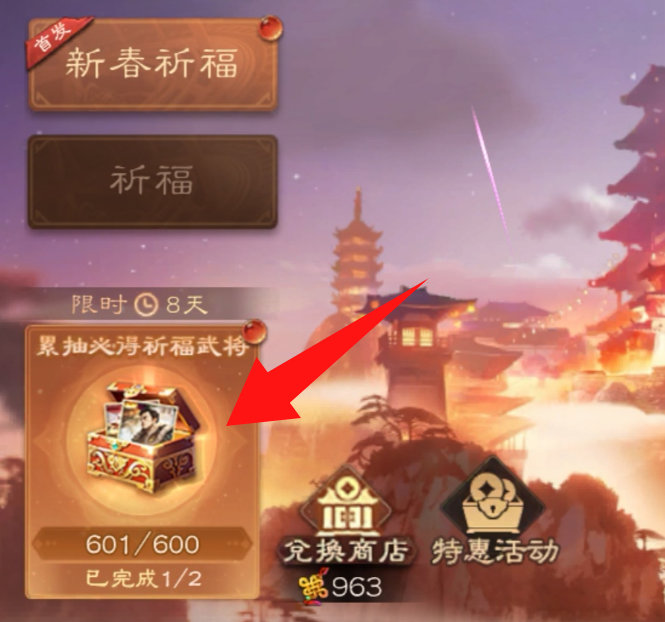 *累计抽取新春祈福600次可领取 新春祈福武将宝箱*1,累计限完成两次。