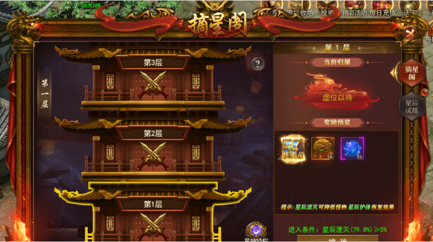 2.摘星阁每层按照星辰湮灭值进行开启,开启后可击杀对应BOSS