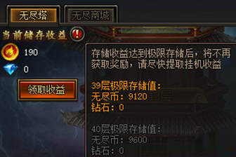 储存收益:根据当前层的收益速度,每隔一小时生成对应数量的无尽币和钻石(不断提升爬塔层数,可加速无尽币和钻石获取速度,70层解锁钻石获取)
