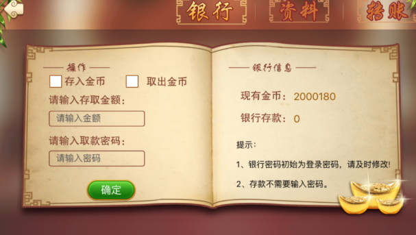 取款:取出金币需要游戏银行密码才能取出