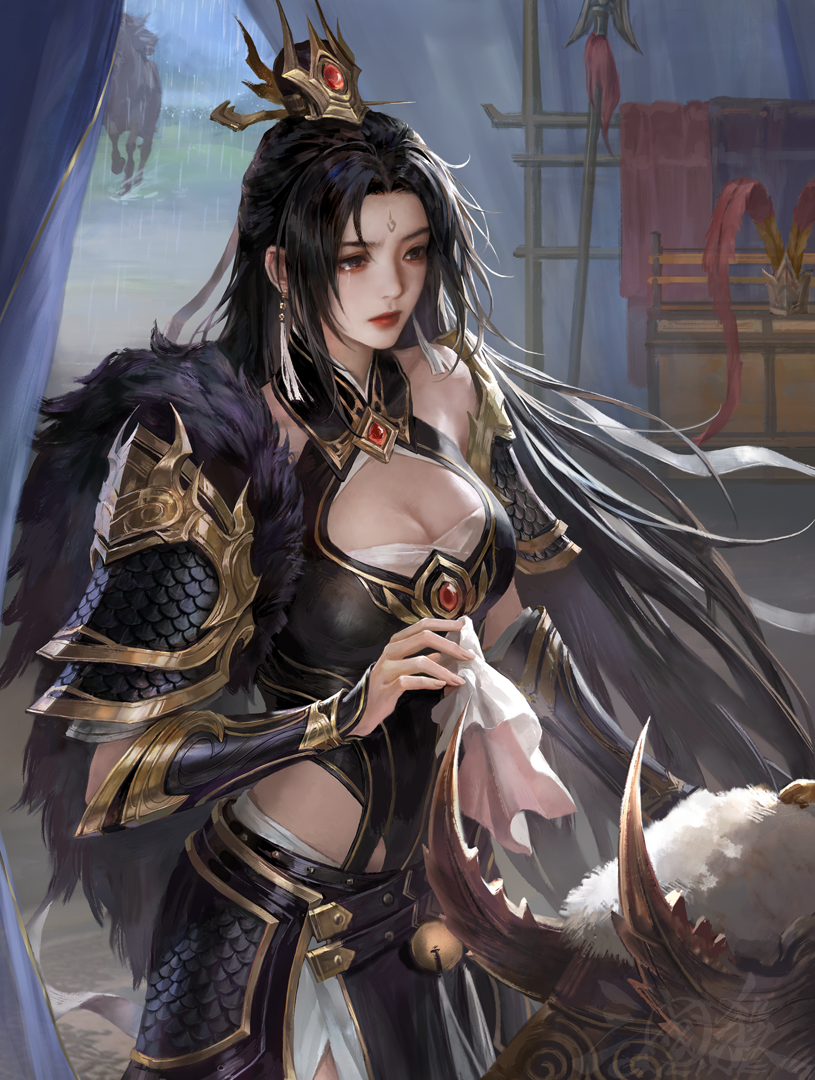 【绮武】:出牌阶段限一次,你可弃置任意张牌,视为使用一张无距离和次数限制的【杀】,目标角色需弃置X张牌(X为你弃置牌的花色数)。若你们因此弃置了牌:且包含【闪】,你获得弃置牌中的【闪】,且本回合不计入手牌上限;且不包含【闪】,此【杀】不可响应。 【妆戎】:锁定技,你的回合开始时,将【束发紫金冠】【玲珑狮蛮带】【红锦百花袍】【无双方天戟】中的随机一件置入你的空置装备栏。每回合结束时,若你发动这些装备的效果至少两次,你增加1点体力上限,回复1点体力(每局游戏限一次)。 |